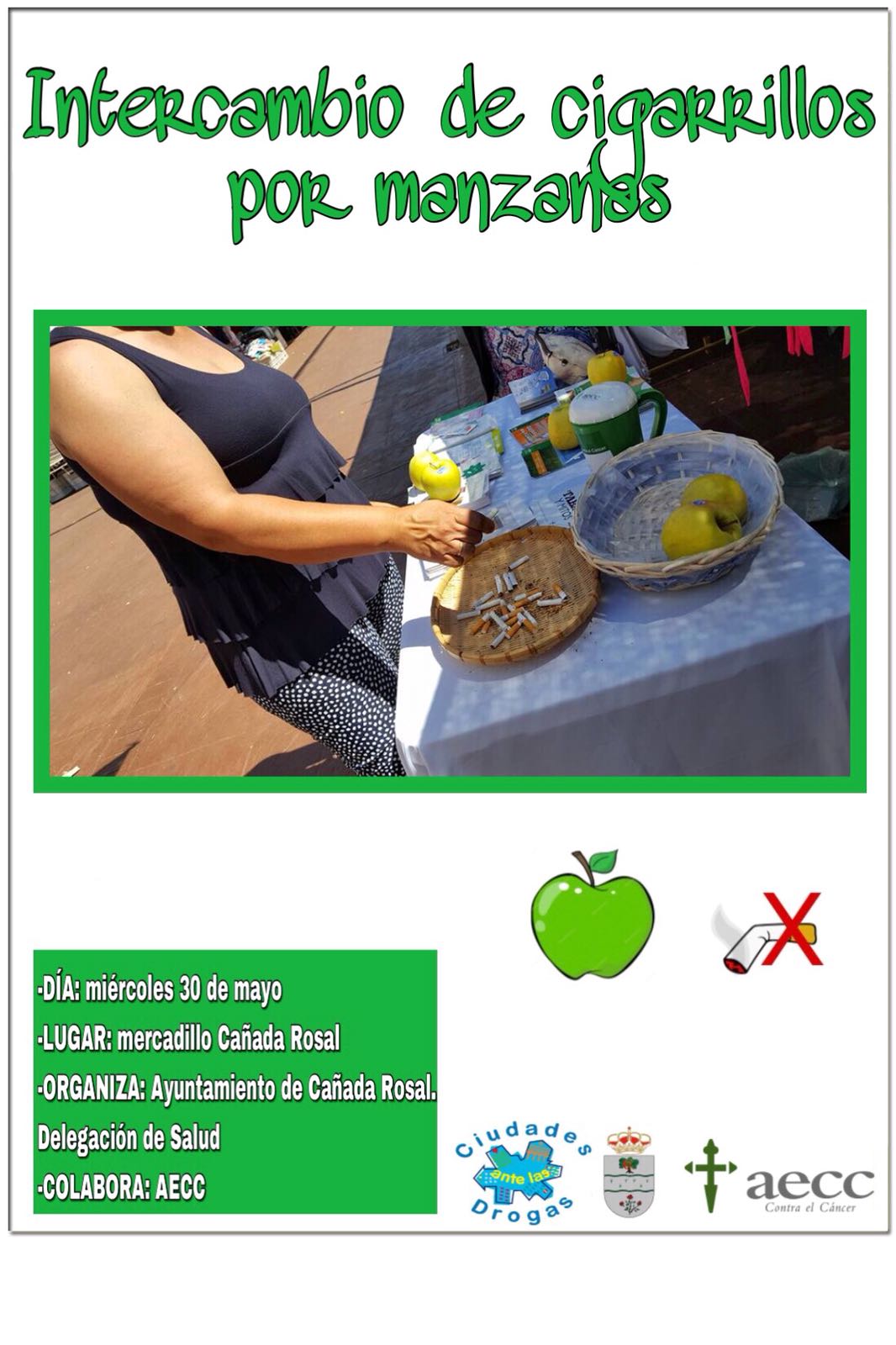 Con motivo de la Semana sin Humos, que comenzó el pasado 25 de mayo y estará hasta el próximo 1 de junio, en Cañada Rosal se ha programado una serie de actividades. Mañana, día 30, se llevará a cabo el intercambio entre cigarrillos y manzanas, haciendo así un guiño a la vida saludable y dejando a un lado el tabaco, que tan nocivo es para la salud. El lugar en el que se realizará esta actividad será en el mercadillo del municipio y se trata de un evento que ha organizado la Delegación de Salud y el ayuntamiento de Cañada, así como también, ha colaborado la Asociación Española Contra el Cáncer (AECC).