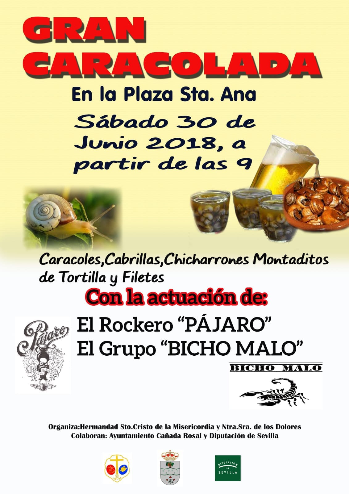 El próximo sábado, 30 de junio, se volverá a celebrar la Gran Caracolada de Cañada Rosal. Los vecinos y vecinas de la localidad podrán degustar exquisitos platos y disfrutar de las actuaciones del rockero “Pájaro” y el grupo “Bicho Malo”. Será a partir de las 21:00 horas en la Plaza Santa Ana.