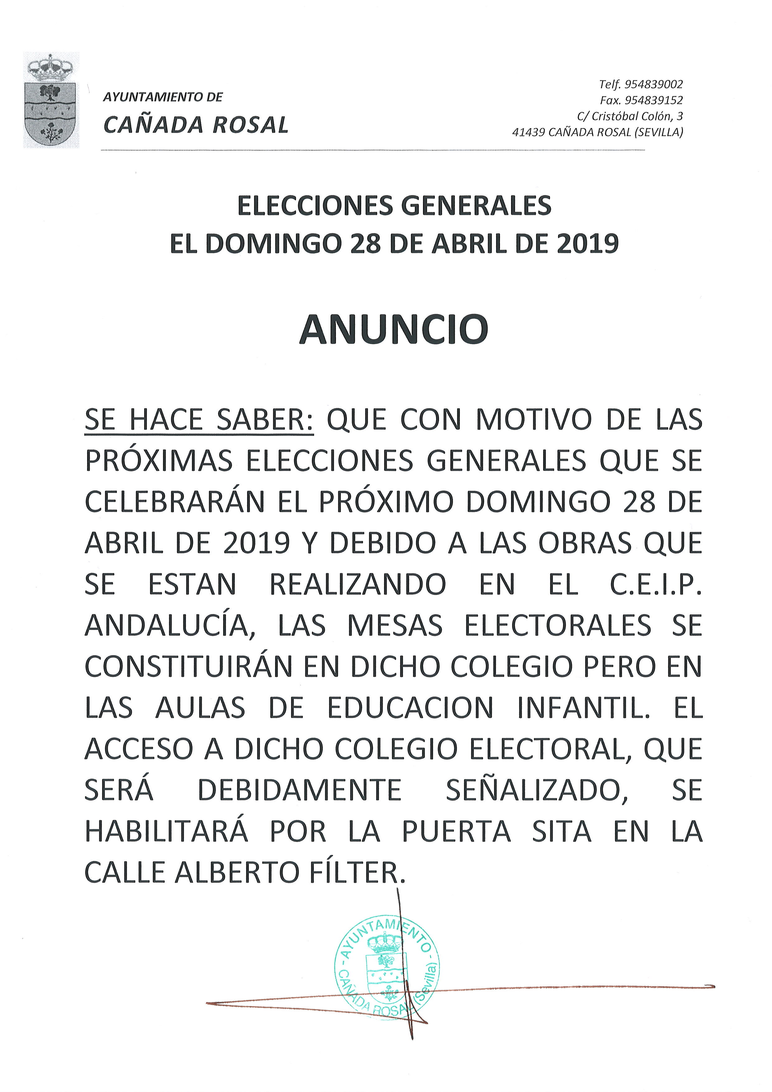 ANUNCIO RELATIVO A LAS ELECCIONES GENERALES DEL DOMINGO DÍA 28 DE ABRIL DE 2019