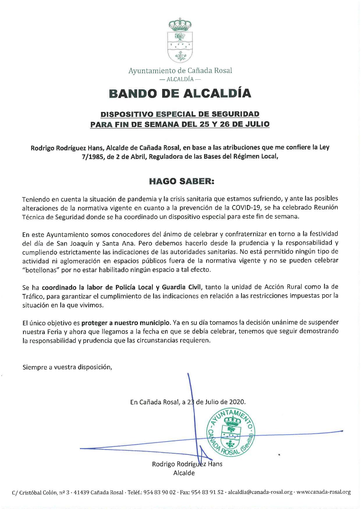 BANDO DE ALCALDIA. DISPOSITIVO ESPECIAL DE SEGURIDAD PARA FIN DE SEMANA DEL 25 Y 26/07/2020