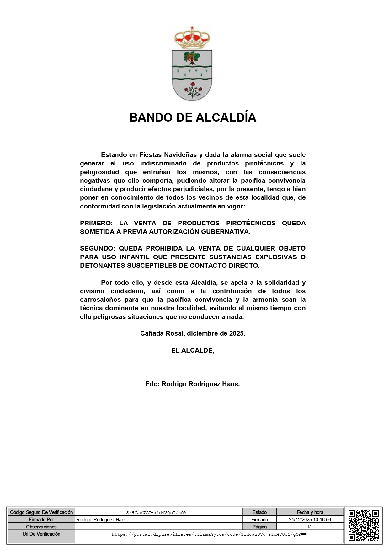Estando en Fiestas Navideñas y dada la alarma social que suele generar el uso indiscriminado de productos pirotécnicos y la peligrosidad que entrañan los mismos, con las consecuencias negativas que ello comporta, pudiendo alterar la pacífica convivencia ciudadana y producir efectos perjudiciales, por la presente, tengo a bien poner en conocimiento de todos los vecinos de esta localidad que, de conformidad con la legislación actualmente en vigor: