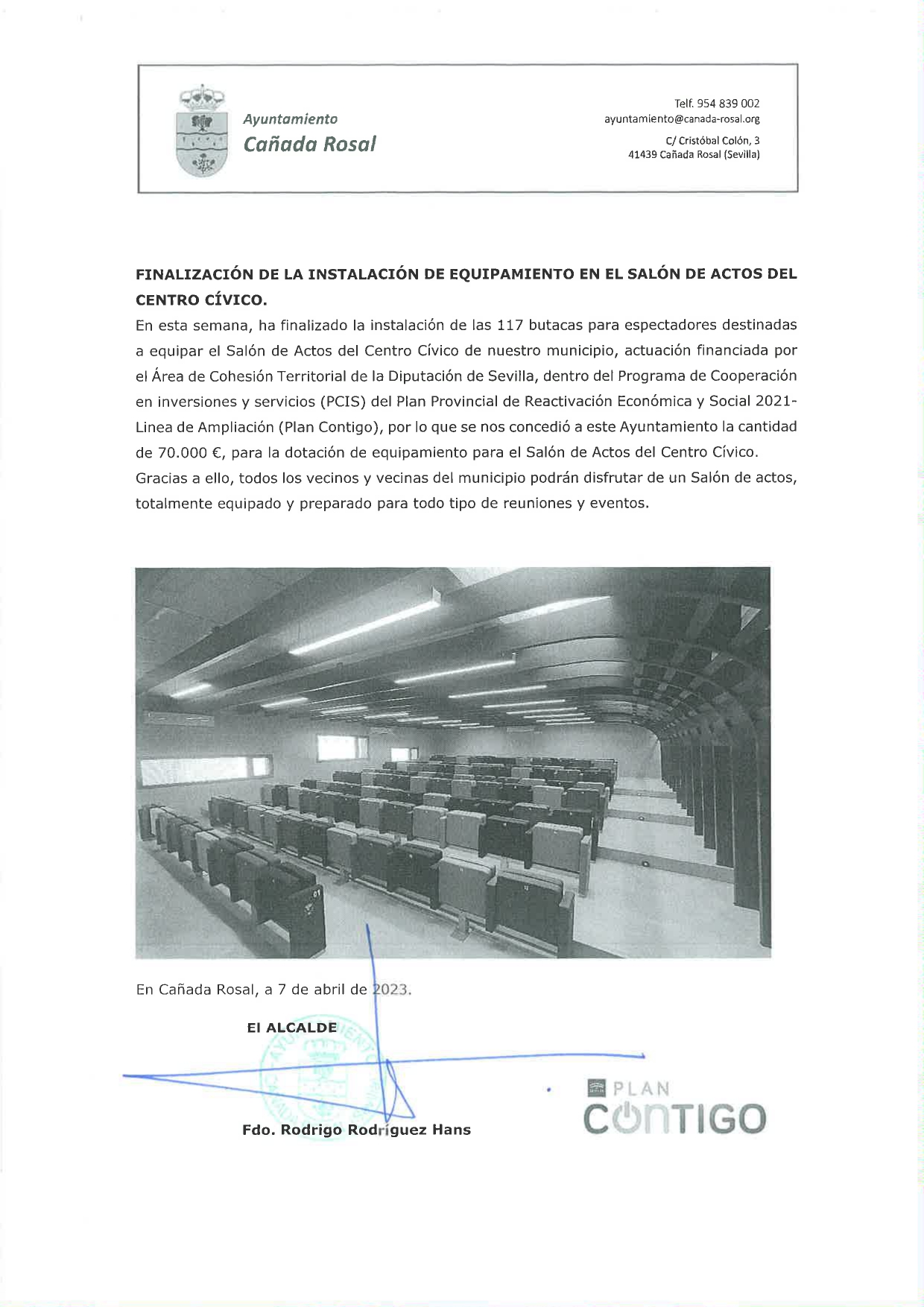 FINALIZACIÓN DE LA INSTALACIÓN DE EQUIPAMIENTO EN EL SALÓN DE ACTOS DEL CENTRO CÍVICO